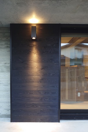 階段室:左面の浮造りRC壁に合せ、右面杉板張り 外壁:杉板張りの戸袋
