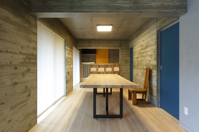 環境配慮や地域材の活用を意識しつつ、災害時には浸水が予想される地域に位置することから、1階をRC造、2・3階を木造の3階建てとした。施主はアレルギーを持つため、特に屋内の塗料については安全性に配慮した。内断熱を施した1階のRC壁は、室内側を熊本県小国杉で覆い、木目を活かしつつコンクリートの雰囲気と調和させるために透明性のあるグレー色の塗料を選択したところ、内覧会で大変好評だった。床は全階とも杉材を使用し、入手の容易さと作業性・安全性の面からOSMOワックスを選択し自ら塗った。テーブルや棚等には知人から譲り受けた手作りの蜜蝋や亜麻仁油を自ら塗って楽しんだ。戸袋と外塀にも地域材を使用し、落ち着いた風合いと価格、作業性の面からブラック色の塗料を選択した。年を経て、メンテナンス作業を家族で楽しみたい。
