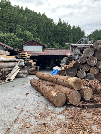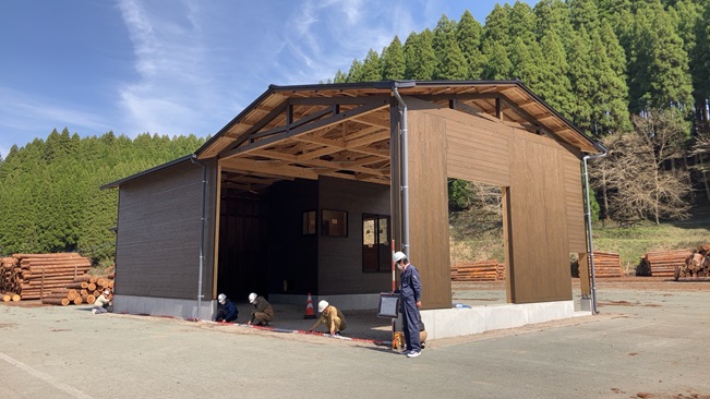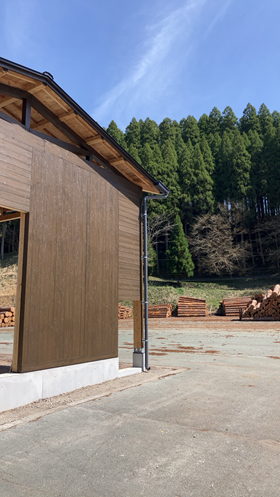 この建物は、熊本県小国町内から伐採・搬出された丸太を選別する機械の上屋です。小国町は、250年前から小国杉を幾世代もの人々が育ててきた、林業の文化が根付くまちで有名です。建築に適した木材として、小国ドームをはじめとして、大型木造の材料として使用されてきました。今回、周辺の風景と馴染むデザインとするために、外壁は小国杉の15oの相じゃくり板を横張りとして、丸太の色と近いダークブラウンとしました。また、小国杉の木目を活かすために、自然系浸透型着色剤とし、耐久性の高いバトンプラスを選択。なお、内部は木地仕上げとして、軒先など雨水が回り込む部材には、自然系浸透型着色剤にて仕上げました。なお、木材自身の膨張や収縮による塗膜割れ・はがれが考えられるので、塗膜でないステインを選択し、外壁を張る前に、木口など見えない部分にも塗装することで耐久性を高めています。